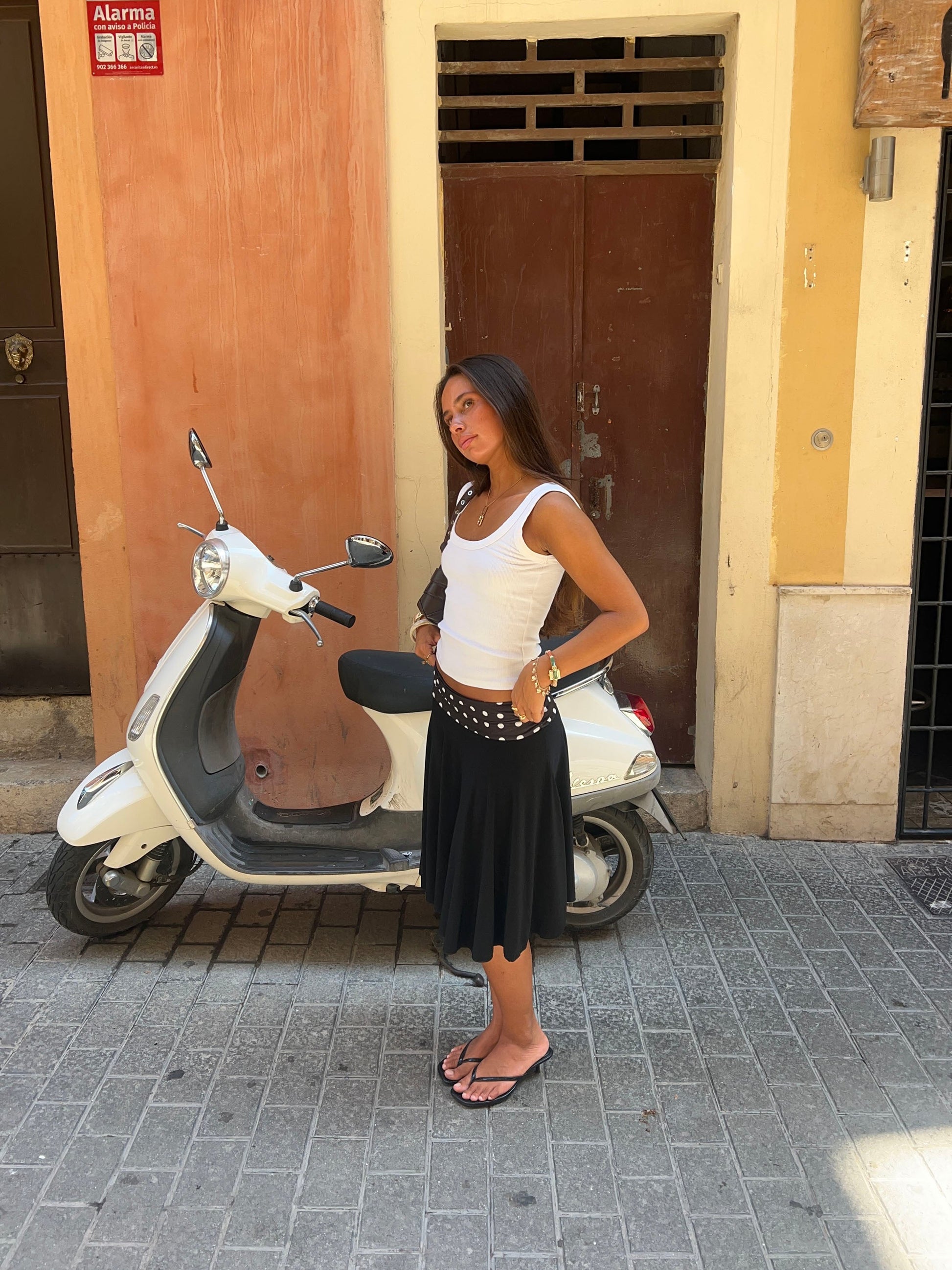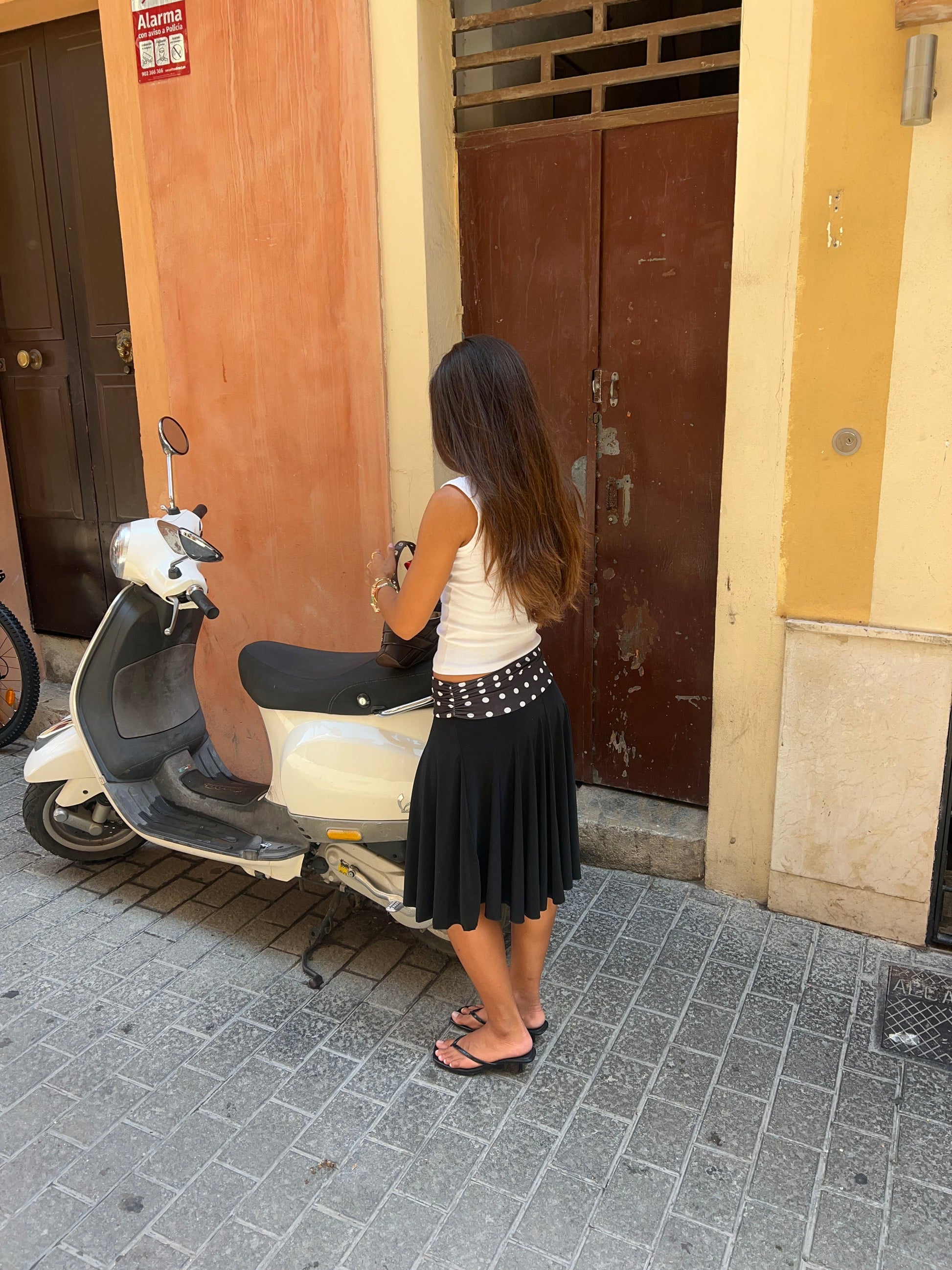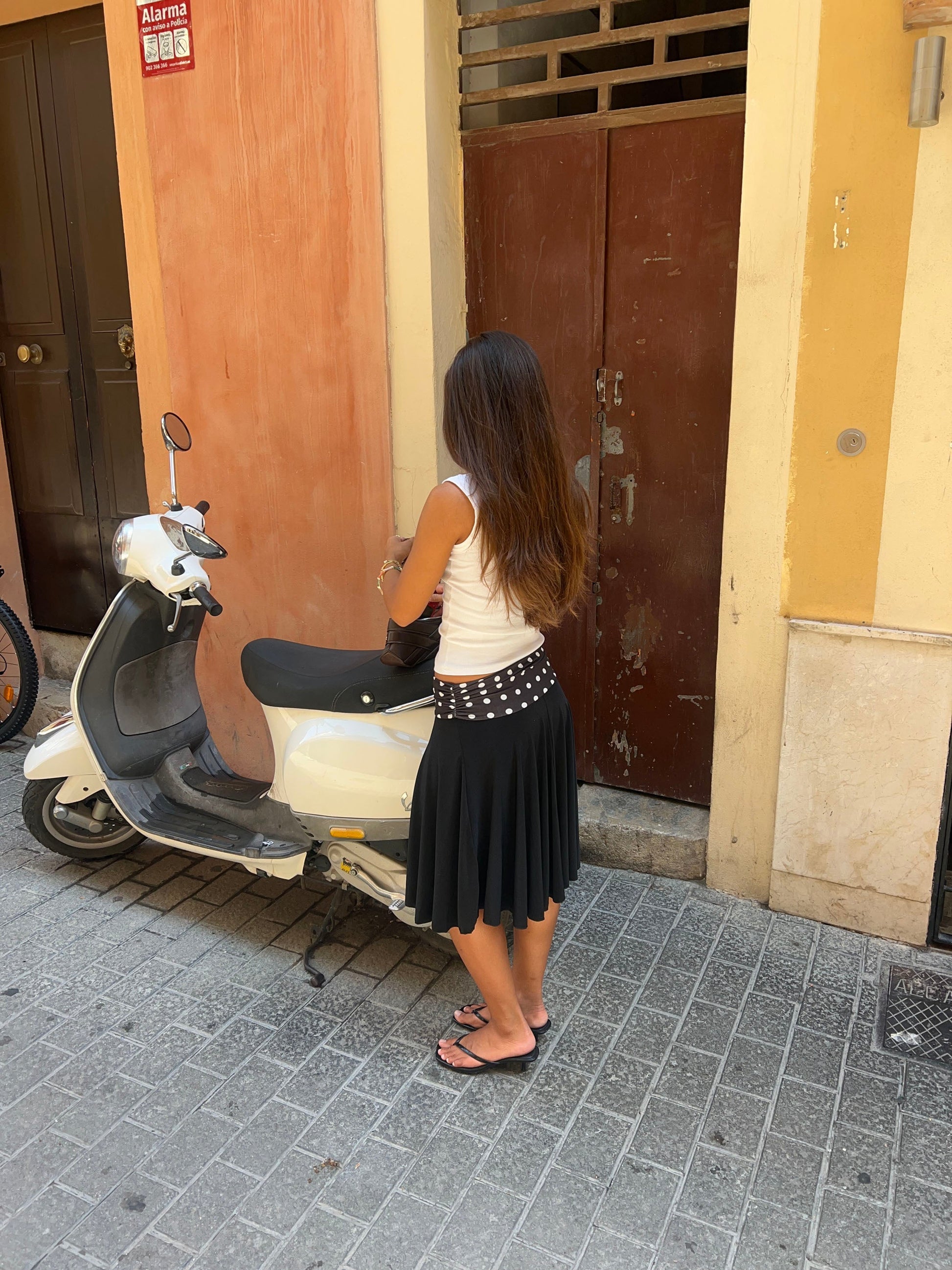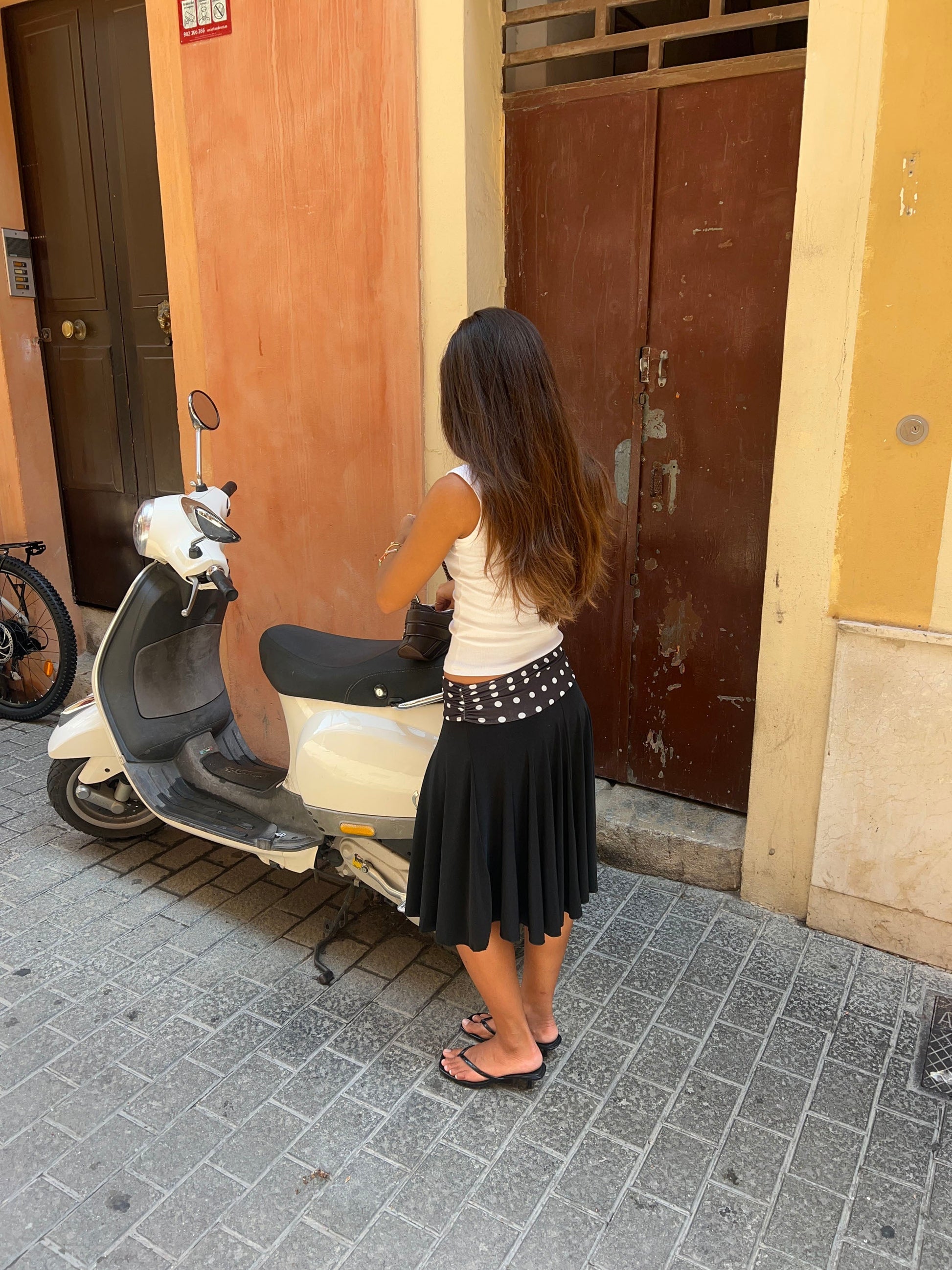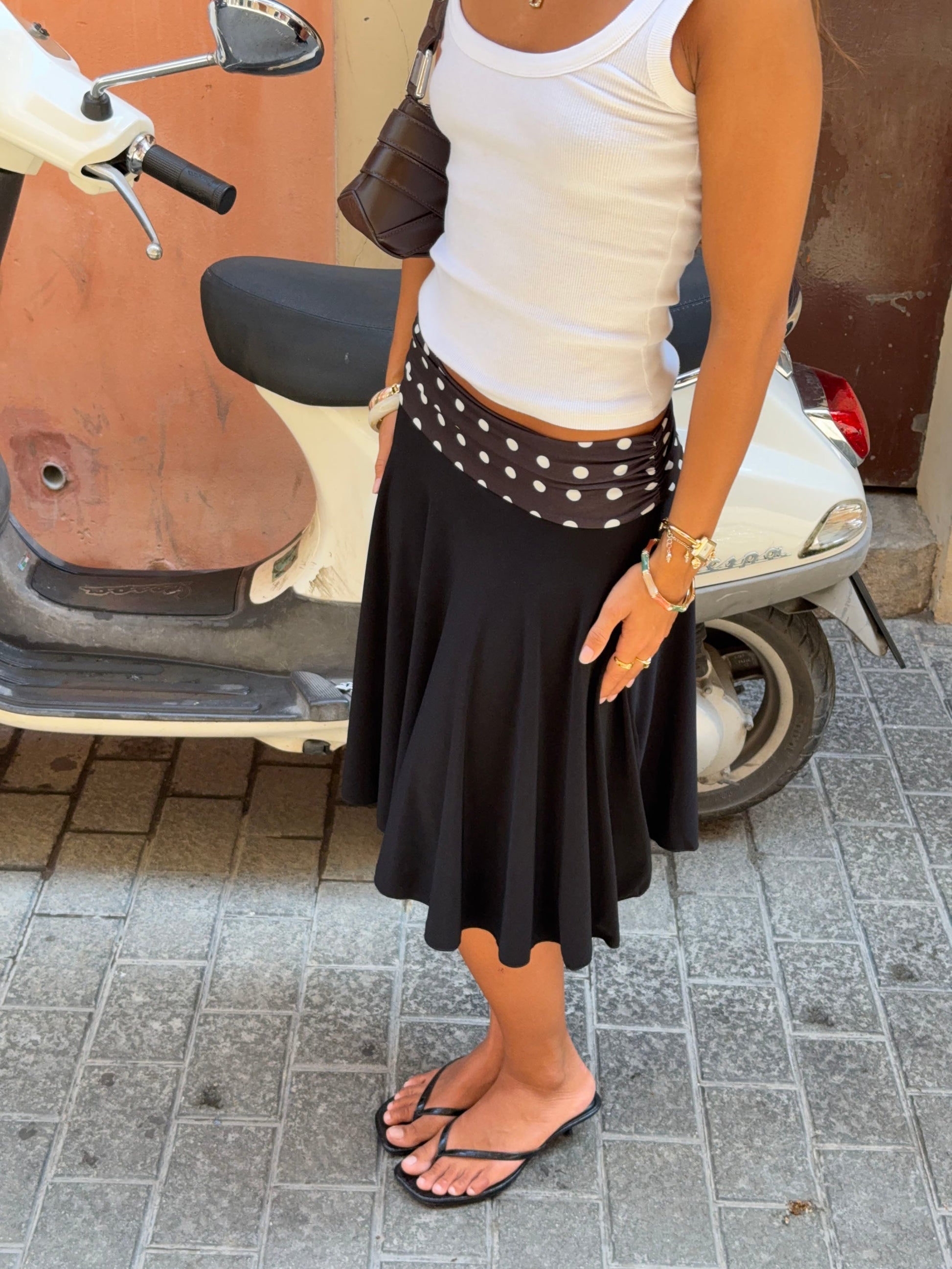 Elegant and versatile skirt. This black skirt combines a classic A-line shape with a modern twist. The top features a fitted waistband in black with white polka dots, adding a playful and feminine touch. The rest of the skirt is black, cut in a wide A-shaped silhouette that drapes softly and creates beautiful movement.
